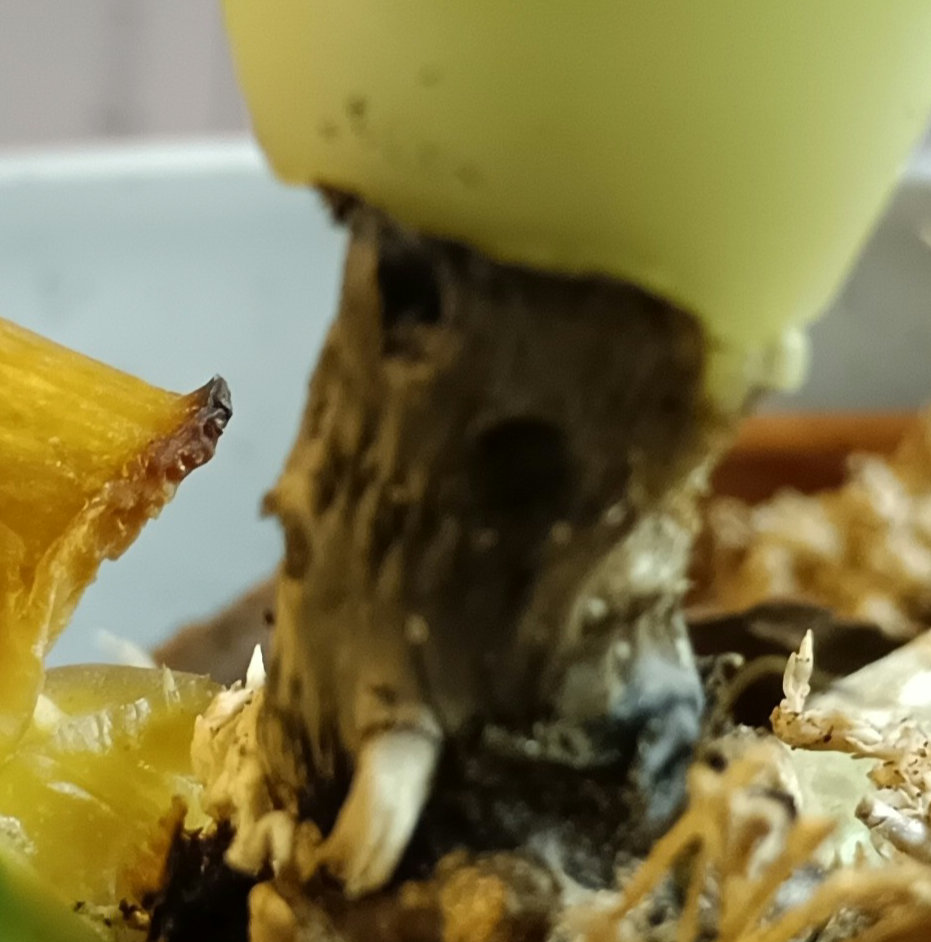 何らかの菌類によるものと思われますが、ペクチンを分解する細菌性の軟腐病、導管組織を破壊する真菌フザリウムなどとは別系統の枯草菌に近い性質の菌による感染症の可能性があります。私の知る範囲ではもっとも広い殺菌作用を持つベノミル剤ベンレート水和剤の散布、塗布の併用を試してみてください。