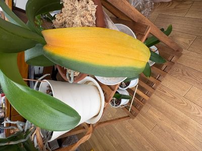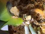 5年目の胡蝶蘭です。1ヶ月ほど前に途中に生えている葉が2〜3枚黄色くぶよぶよになりました。カビのようなものもついていたので掲示板の投稿を参考に葉を切り落とし、傷んだ根を整理してエムダイファー水溶液につけ、1週間ほど乾燥した後新しい水苔に植え替えました。水苔が乾燥してから初めて水やりをしました。