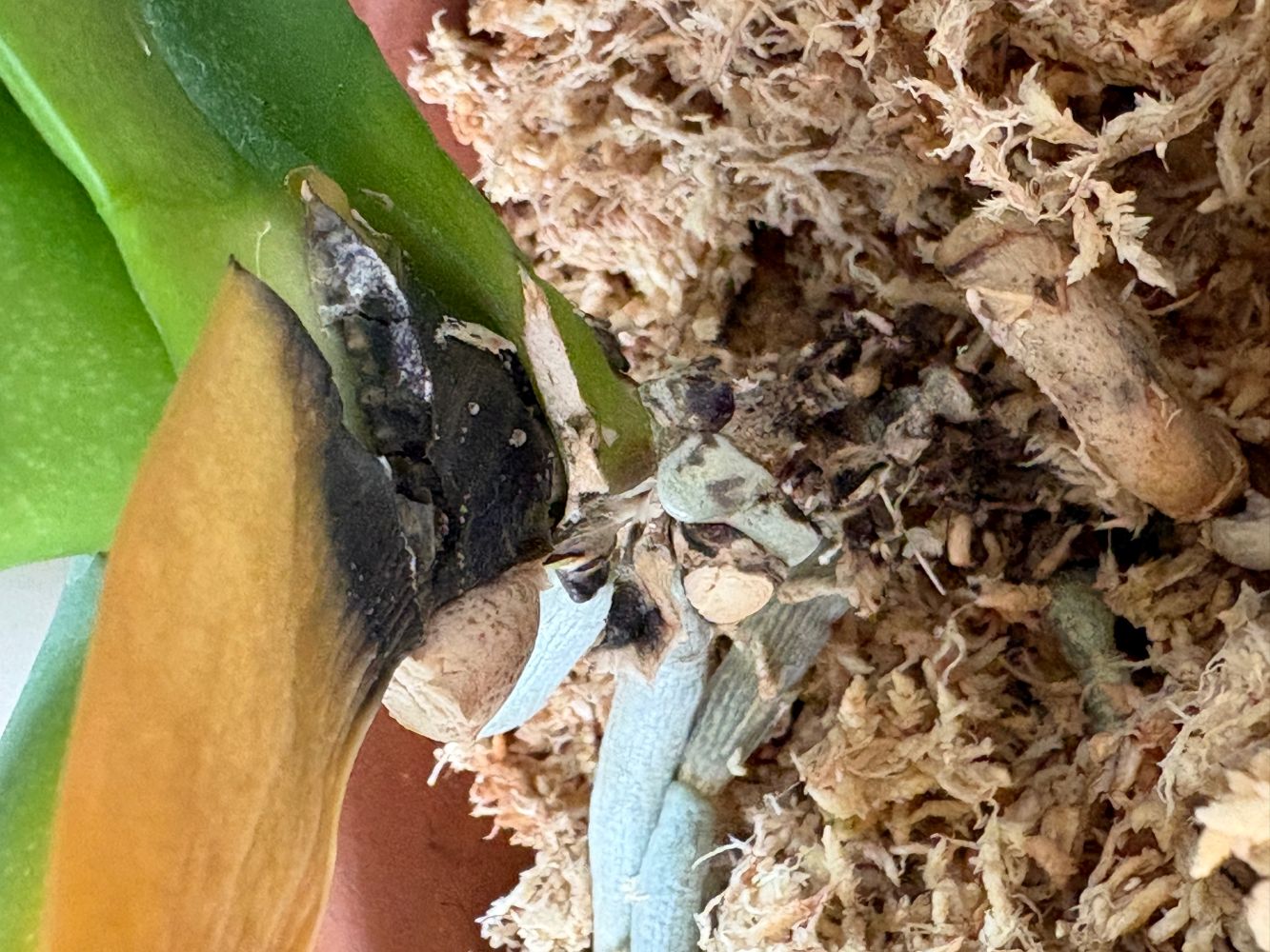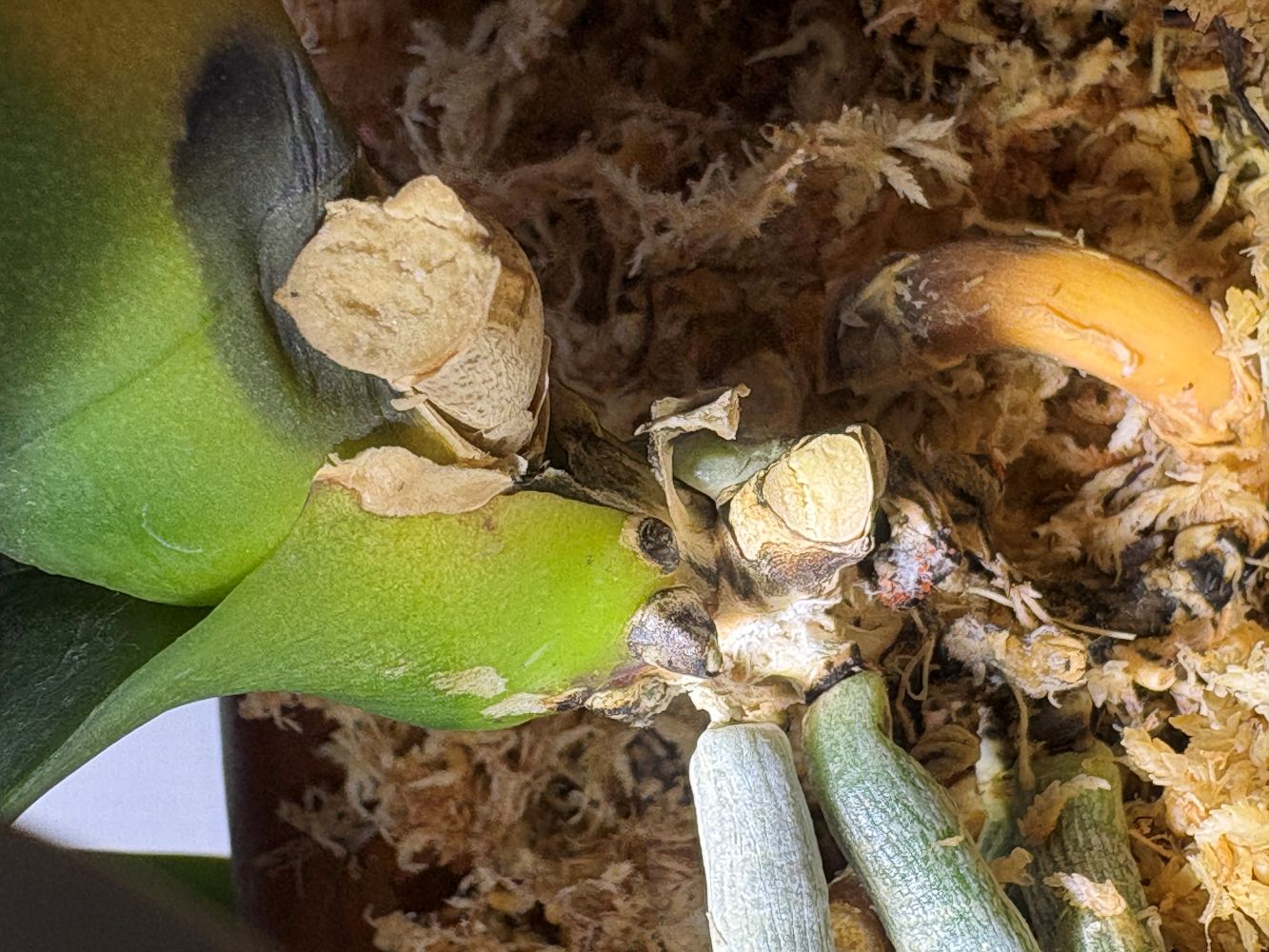 よくみると根の一本にカビが生えていたため水苔を掘ってみると幹?に赤い点々がありました。