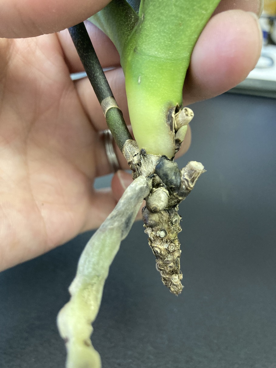 少し前まではポットの中の根も緑色だったのですが、1か月ほど前から急に葉に異常が出始めました。確認すると根腐れが起きており、葉も調べた結果軟腐病のようで、症状の出ていた半分の葉を切り取りました。