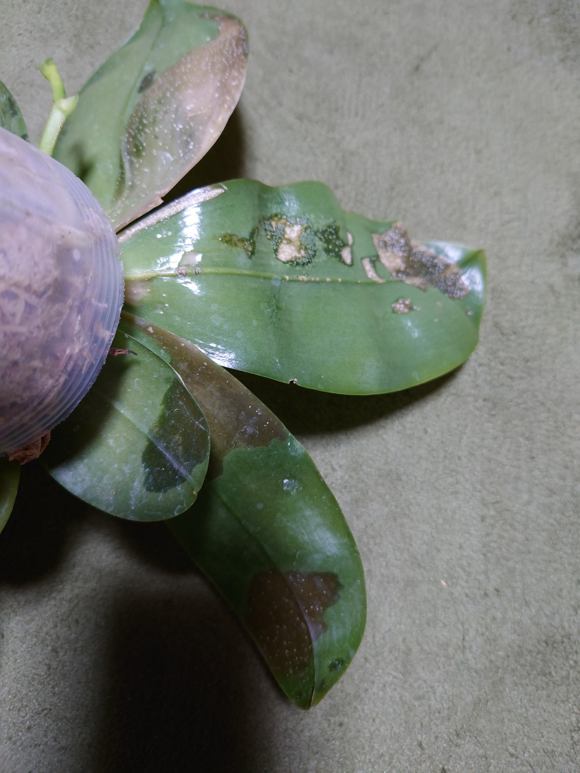 夜間保湿は葉水して穴あきポリ袋で覆うことでかまいませんが朝には必ずポリ袋から出してください。日中は胡蝶蘭は気孔を開きませんので保湿の必要が無いのと、日中もポリ袋内だと腐敗しやすいからです。